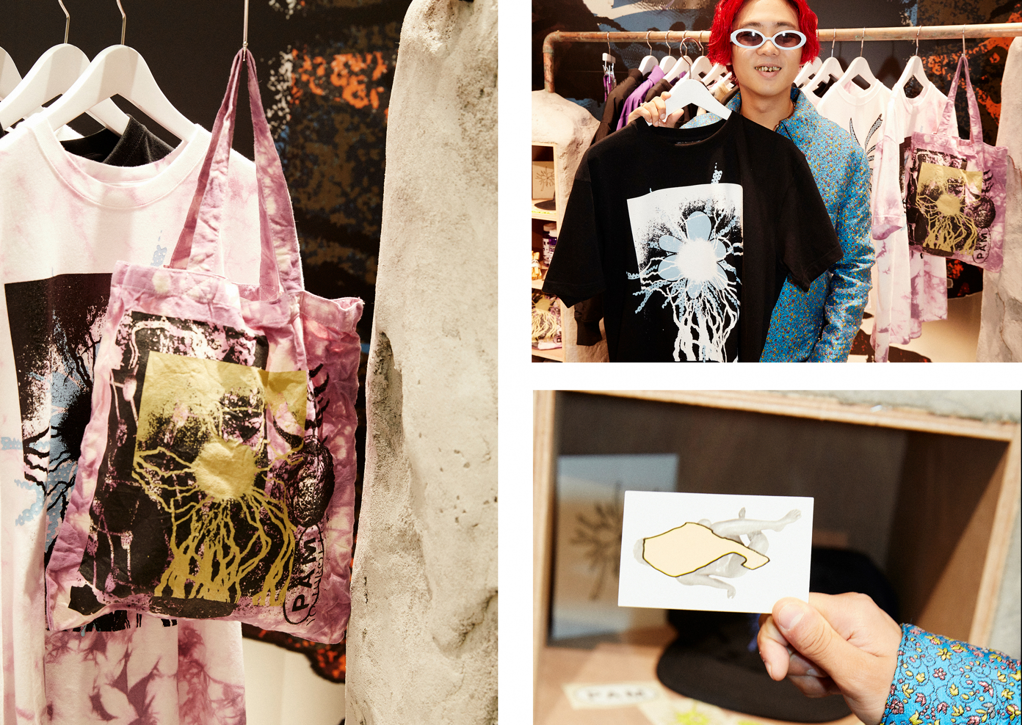 GEYSER PARCO의 일각에서 12월 22일까지 팝업 숍을 개최하고 있는 것은 에지가 효과가 있는 디자인으로 인기를 모으는 호주발 브랜드 「P.A.M.(Perks and Mini)」와 그래픽 아티스트 YOSHIROTTEN씨.「RE_Generation」을 테마로 재활용이나 삼림 재생을 의식해, 「P.A.M.」의 데드스톡 아이템을 어레인지한 캡슐 컬렉션과 한정 아이템을 전개한다.게다가 「P.A.M.」의 디자이너, Misha Hollenbach씨와 YOSHIROTTEN씨의 아트워크집 「Stone Circle Journal」도 판매.실은 레이지씨, YOSHIROTTEN씨와 공사 모두 연결을 가지고 있다고 한다.「우리들 OKAMOTO'S의 MV나 CD 자켓의 디자인을 다룬 적이 있습니다.이 콜라보레이션하고 있는 아이템의 디자인은, 꽃의 자연스러운 따뜻함에, YOSHIROTTEN씨다운 무기질인 뉘앙스가 섞여 있고 멋있는"